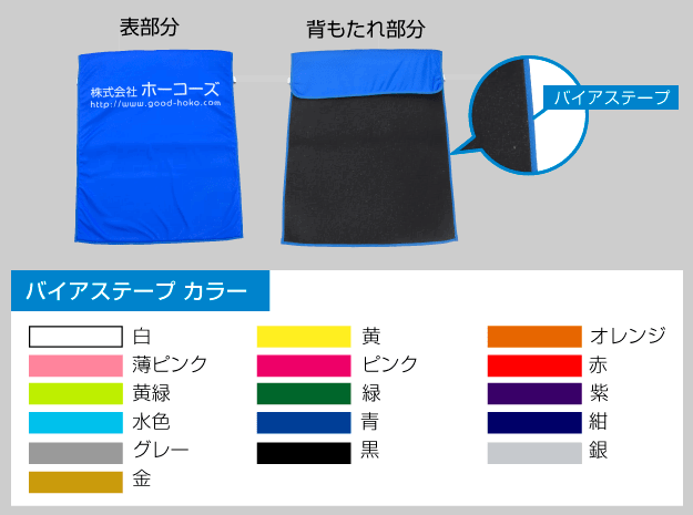 椅子カバー・チェアカバーの素材は、スムース+スポンジ+ウレタン+周囲バイアステープ加工にて製作されています。バイアステープは白・青・赤・緑・紺色・黒・黄色など16種類ありこの中から選択することになります。表面は昇華転写印刷にて鮮やか発色性を実現し、型を使用しないため多品種小ロットオーダーに対応できます。