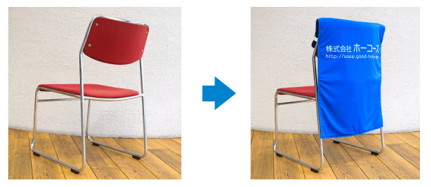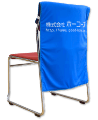 しかし会社説明会や展示会・イベントなどで使用される椅子は様々な形状があります。背もたれについてはフラットなもの、わん曲しているもの、厚みのあるもの、突起物がついているものなど実に多くの種類の椅子の形状があります。そこで大切なことが椅子カバーの形状に柔軟性があるかということです。意外と椅子の形状に合わせやすい椅子カバー・チェアカバーは少ないのが現状です。自社の決まった椅子に使用するのではなく、なるべく多くの椅子の形状に合わせれるようにするため、大型出力屋では、サイド面を固定せずゴムを使用することで伸縮しやすい椅子カバー・チェアカバーを採用しています。