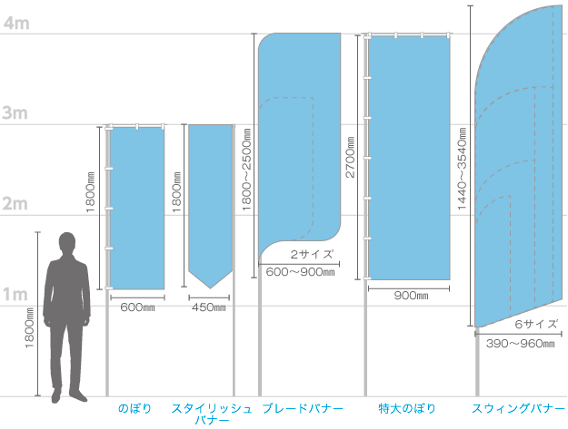 一般的なのぼりがW600×H1800mmというサイズに対して、特大のぼりはW900×H2700mmのサイズになり、約2.5倍の大きさになります。